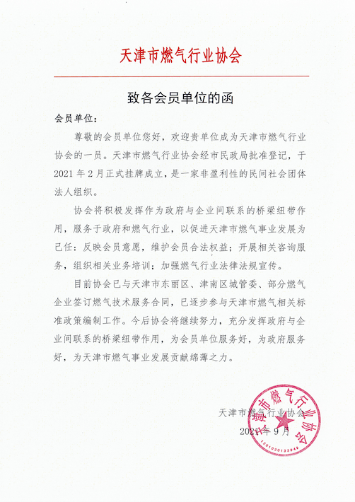 天津市燃气行业协会会员单位证书